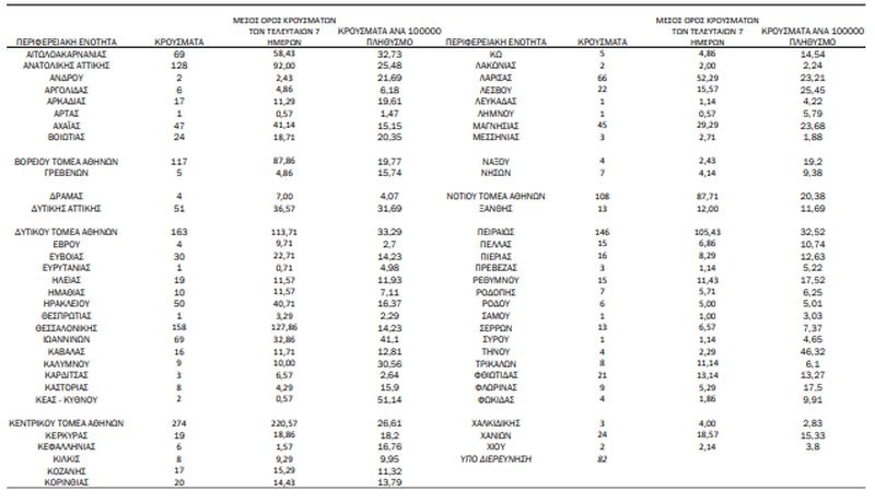 Από το σύνολο των 2.020 νέων κρουσμάτων του νέου ιού στη χώρα 5 είναι εισαγόμενα εκ των οποίων 3 εντοπίστηκαν κατόπιν ελέγχων στις πύλες εισόδου της χώρας. Η κατανομή των 2.015 νέων εγχώριων κρουσμάτων ανά Περιφερειακή Ενότητα παρουσιάζεται στον κατωτέρω πίνακα.
