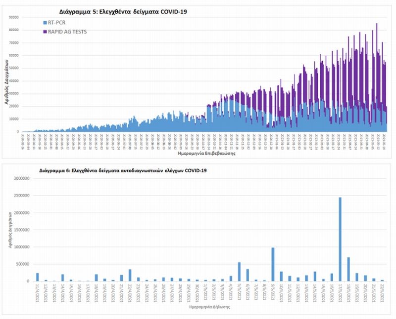 Από την 1η Ιανουαρίου 2020 μέχρι σήμερα, στα εργαστήρια που διενεργούν ελέγχους για τον νέο κορονοϊό (SARS-CoV-2) και που δηλώνουν συστηματικά το σύνολο των δειγμάτων που ελέγχουν, έχουν συνολικά ελεγχθεί 4.972.207 κλινικά δείγματα ενώ από Μονάδες Υγείας και Κλιμάκια του ΕΟΔΥ που διενεργούν ελέγχους Rapid Ag έχουν ελεγχθεί 4.215.435 δείγματα. O μέσος όρος του επταημέρου είναι 47.352 δειγματοληπτικοί έλεγχοι.