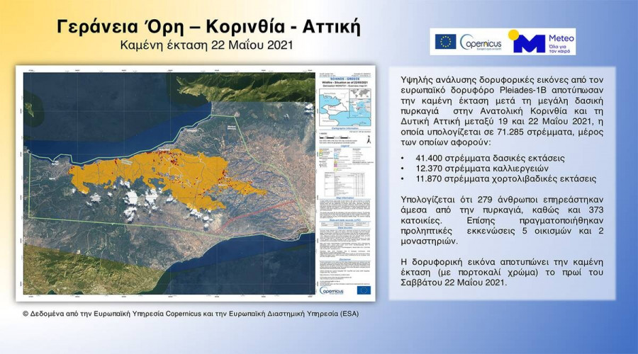 Οι νεότερες δορυφορικές εκτιμήσεις των καμένων εκτάσεων στην Ανατολική Κορινθία και στη Δυτική Αττική, μετά την ύφεση της μεγάλης πυρκαγιάς που ξεκίνησε από το Σχίνο Κορινθίας το βράδυ της Τετάρτης, δείχνουν ότι περίπου 71.285 στρέμματα έγιναν στάχτη μέσα σε διάστημα λιγότερο των τριών ημερών.