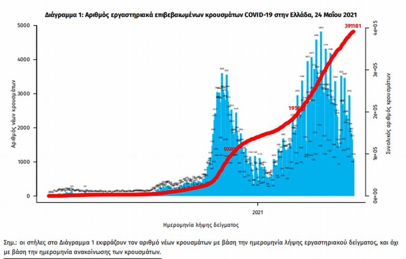 Κορονοϊός - Όλες οι ειδήσεις: Τη Δευτέρα, 24 Μαΐου 2021, ο ΕΟΔΥ ανακοίνωσε, 1.381 νέα κρούσματα του νέου ιού στη χώρα, εκ των οποίων τα τρία εντοπίστηκαν κατόπιν ελέγχων στις πύλες εισόδου της χώρας.