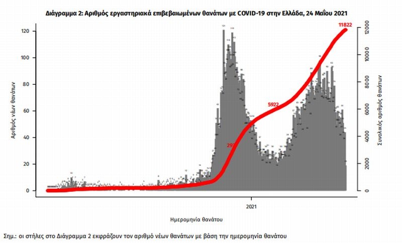 Οι νέοι θάνατοι ασθενών με COVID-19 είναι 50, ενώ από την έναρξη της επιδημίας έχουν καταγραφεί συνολικά 11.822 θάνατοι. Το 95.2% είχε υποκείμενο νόσημα ή/και ηλικία 70 ετών και άνω.