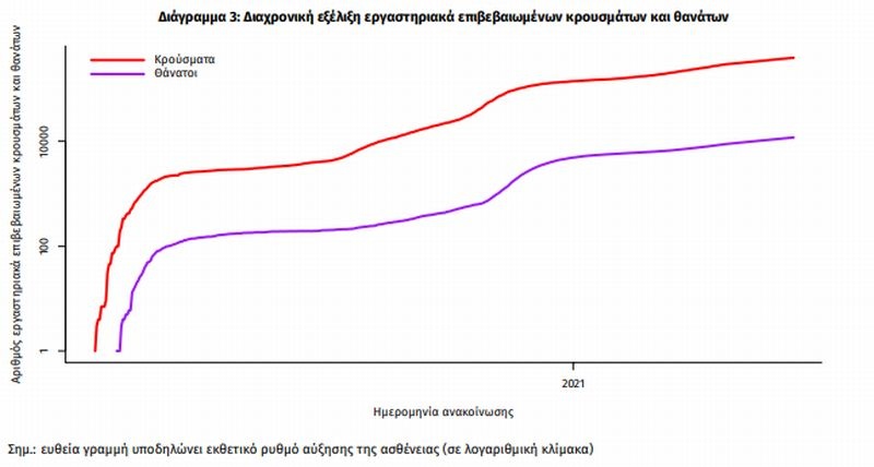 Η διαχρονική εξέλιξη των συνολικών κρουσμάτων και συνολικού αριθμού των θανάτων ασθενών COVID-19 παρουσιάζεται στο ακόλουθο διάγραμμα.