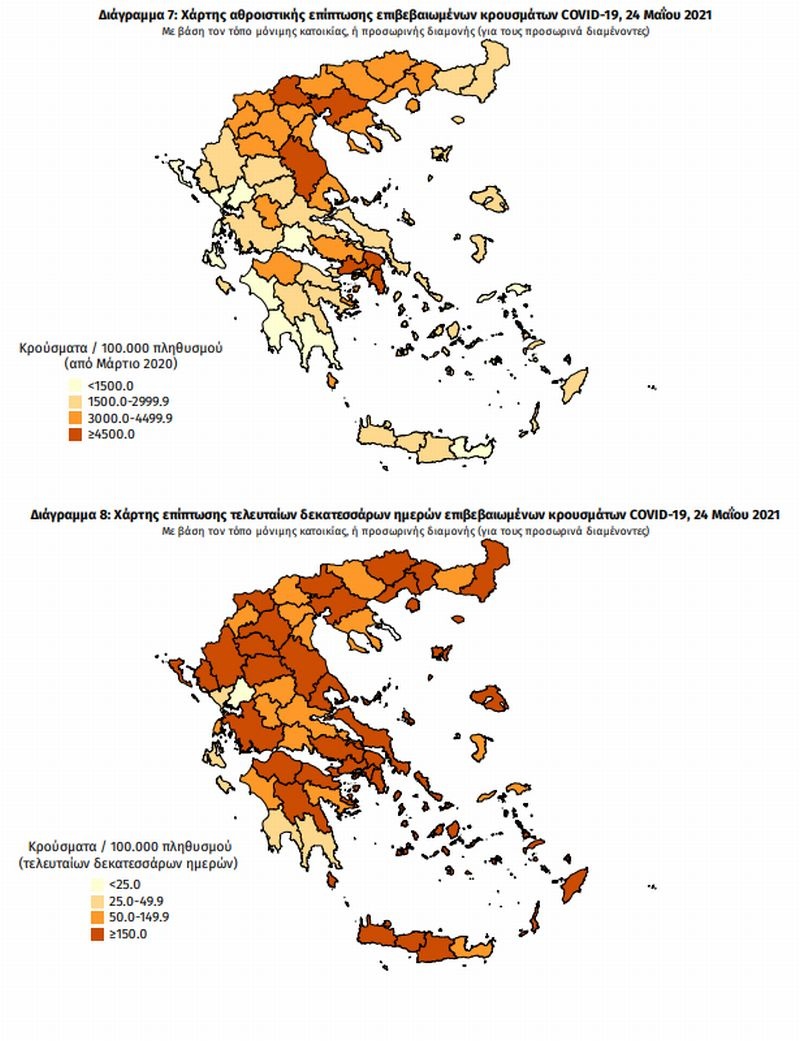 Πίνακας 2: Ημερήσιος αριθμός και κρούσματα ανά 100.000 πληθυσμού επιβεβαιωμένων εγχώριων κρουσμάτων COVID-19 ανά περιφερειακή ενότητα στις 24 Μαΐου 2021: