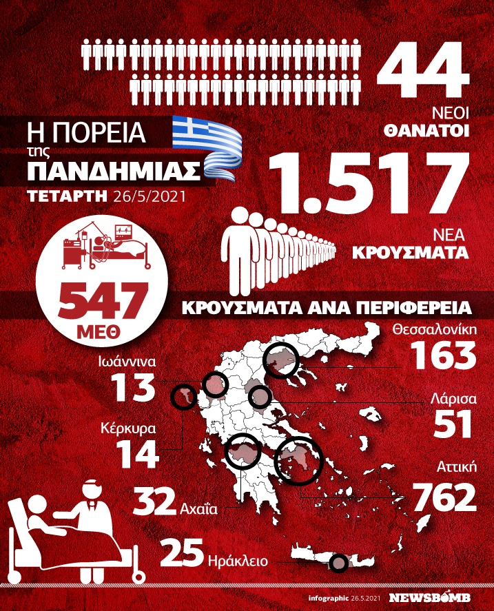 Κρούσματα σήμερα: 1.517 νέα ανακοίνωσε ο ΕΟΔΥ, 44 θάνατοι σε 24 ώρες, στους 547 οι διασωληνωμένοι