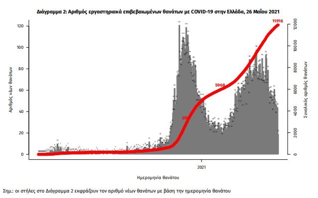 Οι νέοι θάνατοι ασθενών με COVID-19 είναι 44, ενώ από την έναρξη της επιδημίας έχουν καταγραφεί συνολικά 11.916 θάνατοι. Το 95.1% είχε υποκείμενο νόσημα ή/και ηλικία 70 ετών και άνω.