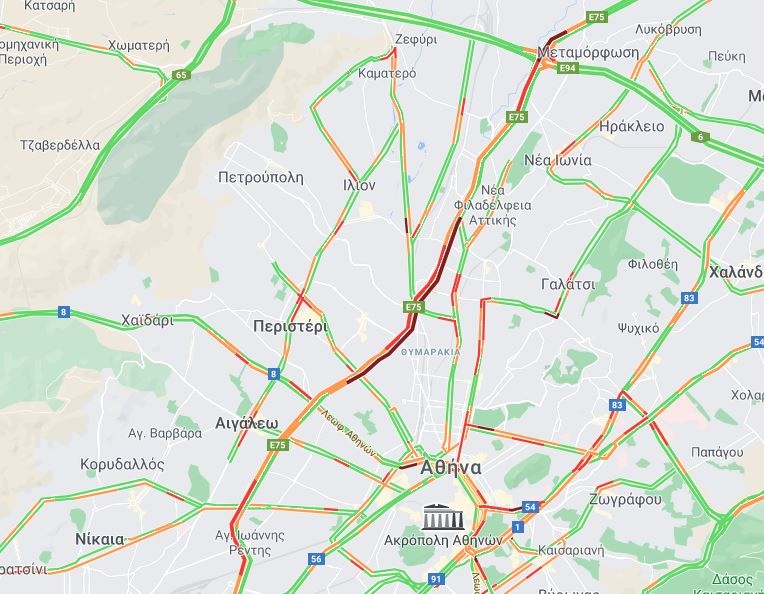 Η κίνηση που έχει ξεκινήσει από νωρίς το πρωί, παραμένει με τα οχήματα να κινούνται με χαμηλές ταχύτητες από το ύψος της Μεταμόρφωσης μέχρι του Ρέντη.