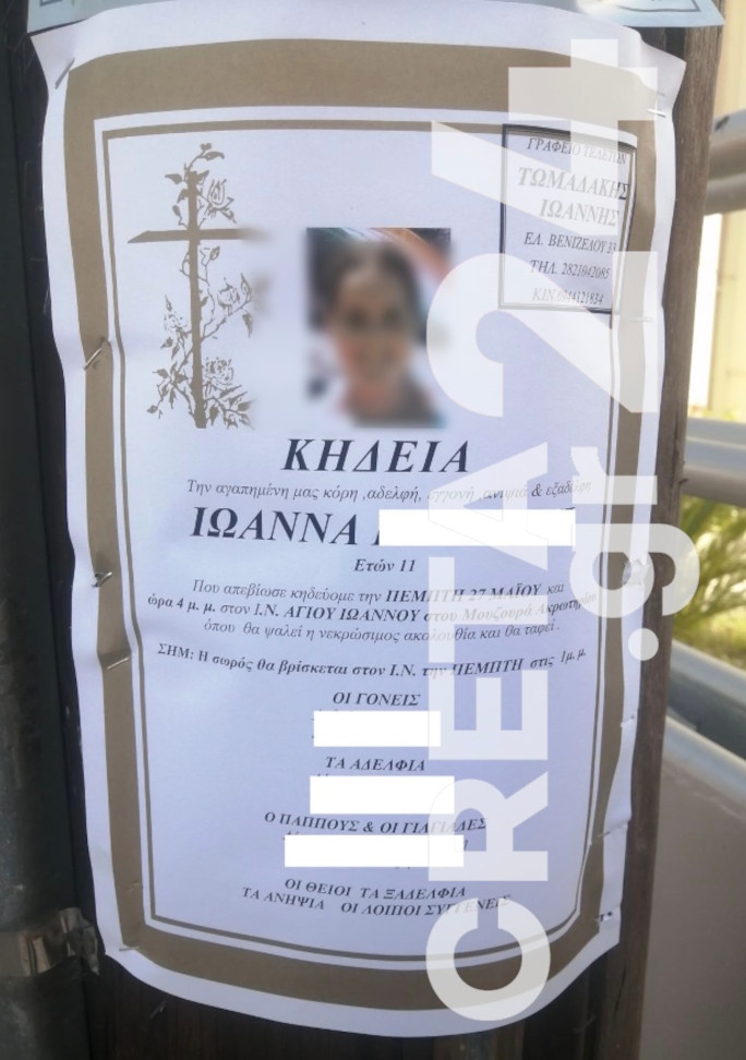 Συγκλονισμένη είναι η κοινωνία των Χανίων με τον άδικο χαμό της 11χρονης Ιωάννας, η οποία εντοπίστηκε νεκρή το απόγευμα της Τετάρτης σε απόκρημνο σημείο στην περιοχή των Αγίων Αποστόλων.