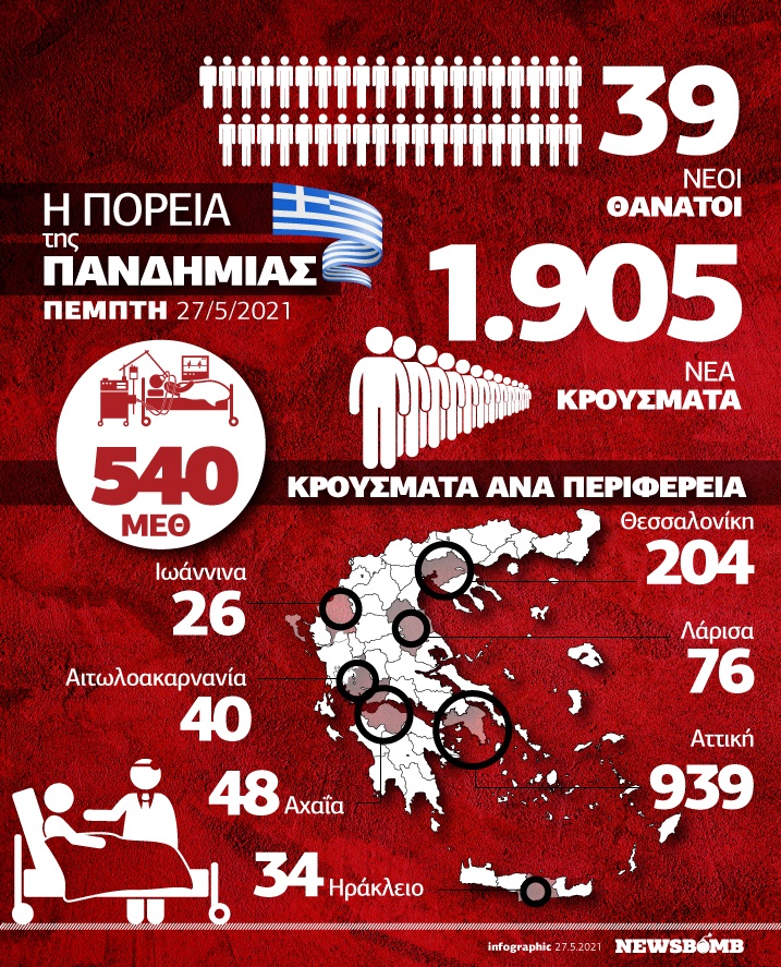 Κρούσματα σήμερα: 1.905 νέα, 39 θάνατοι, 540 διασωληνωμένοι ανακοίνωσε ο ΕΟΔΥ