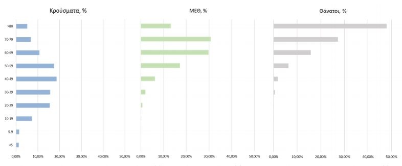 Ακολούθως παρουσιάζεται η ηλικιακή κατανομή των (α) συνολικών κρουσμάτων, (β) των περιστατικών που κατέληξαν σε θάνατο και (γ) των ασθενών που νοσηλεύονται διασωληνωμένοι: