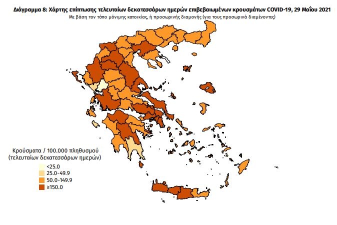 Πίνακας 2: Ημερήσιος αριθμός και κρούσματα ανά 100.000 πληθυσμού επιβεβαιωμένων εγχώριων κρουσμάτων COVID-19 ανά περιφερειακή ενότητα στις 29 Μαΐου 2021.