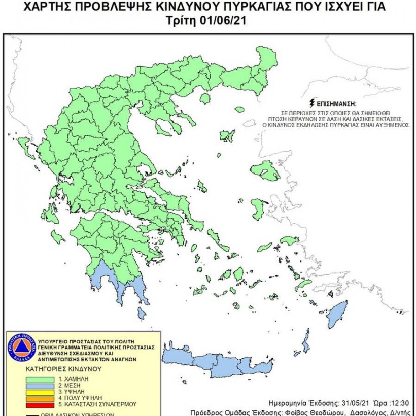 Φωτιές στην Ελλάδα - Όλες οι ειδήσεις: Η Γενική Γραμματεία Πολιτικής Προστασίας στο πλαίσιο της τρέχουσας αντιπυρικής περιόδου ανακοινώνει την καθημερινή έκδοση του Ημερήσιου Χάρτη Πρόβλεψης Κινδύνου Πυρκαγιάς για τη φετινή αντιπυρική περίοδο και συγκεκριμένα για το διάστημα από την Τρίτη 1η Ιουνίου έως την Κυριακή 31η Οκτωβρίου 2021.