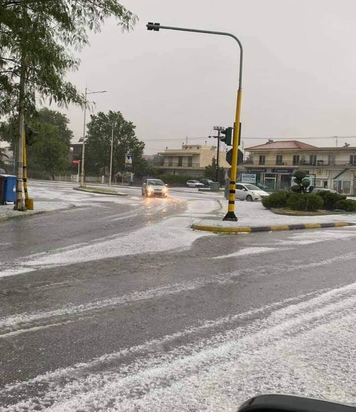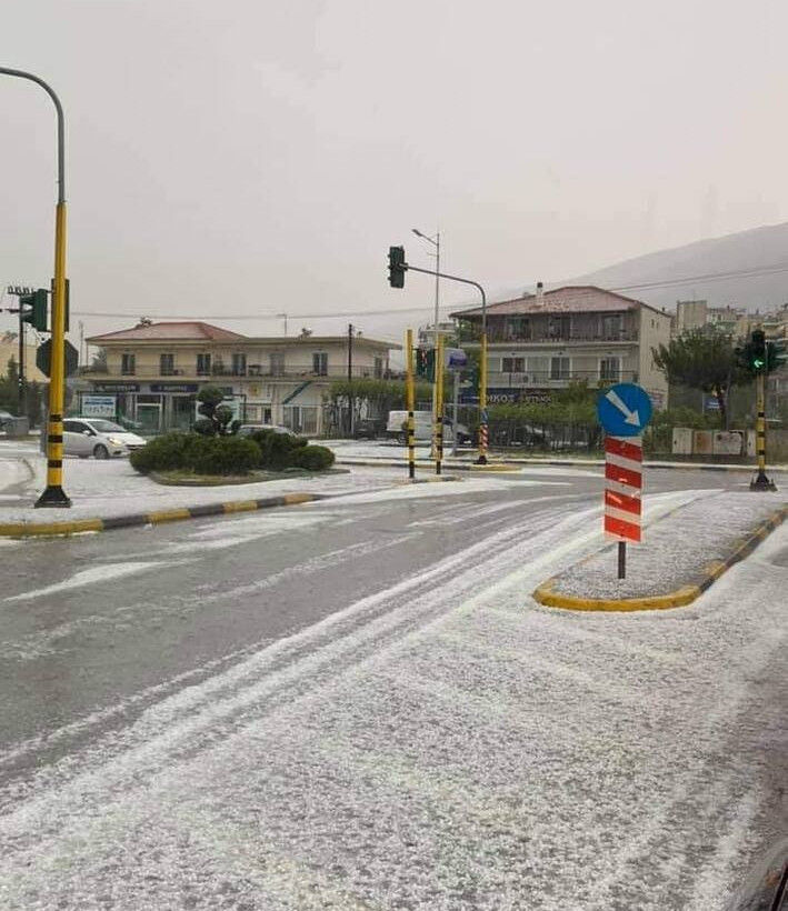 Παρά το γεγονός πως το πρωί επικρατούσε ηλιοφάνεια, το σκηνικό του καιρού άλλαξε απότομα το μεσημέρι με τη βροχή να είναι ισχυρή και έντονη. Μάλιστα, σημειώθηκε και ιδιαίτερα έντονη χαλαζόπτωση ακόμη και μέσα στην πόλη, με το χαλάζι να σκεπάζει δρόμους και αυλές σπιτιών.