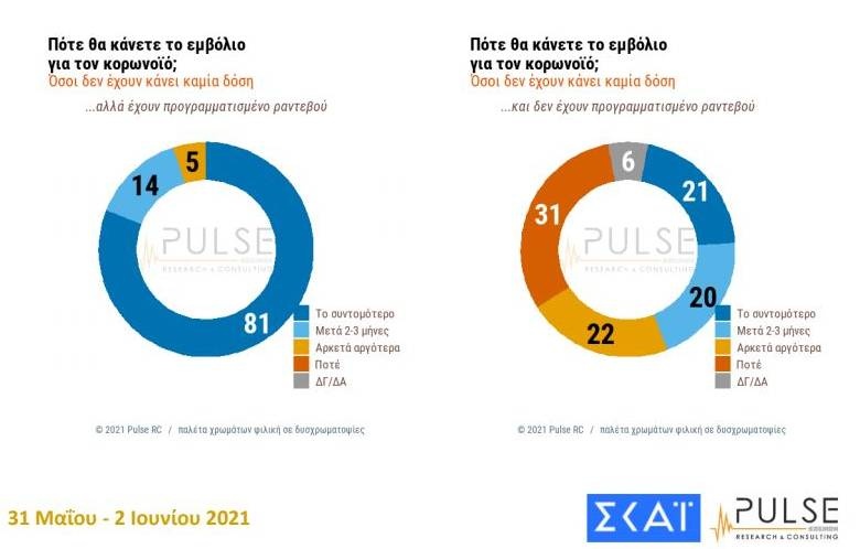 Σχετικά με το πότε θα λάβουν το εμβόλιο κατά της Covid-19, όσοι δεν το έχουν κάνει ακόμα και έχουν προγραμματίσει το ραντεβού τους, το 81% απάντησε «το συντομότερο», ένα ποσοστό 14% δήλωσε ότι θα εμβολιαστεί «μετά από 2-3 μήνες» και μόλις το 5% είπε «αρκετά αργότερα». Σχετικά με εκείνους που δεν έχουν κλείσει ακόμα ραντεβού, το 31% σημείωσε ότι δε θα το κάνει «ποτέ», το 22% «αρκετά αργότερα», το 21% «το συντομότερο» το 20% «μετά από 2-3 μήνες» και το 6% «δεν γνωρίζω-δεν απαντώ».