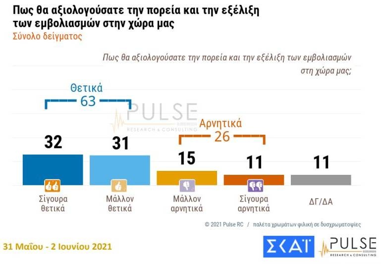 Απαντώντας στην ερώτηση πώς θα αξιολογούσατε την πορεία και την εξέλιξη των εμβολιασμών στη χώρα μας, το 63% του δείγματος απαντά «θετικά» και μόλις 26% αρνητικά. Ειδικά, αυτοί που έχουν λάβει ήδη κάποια δόση του εμβολίου, την αποτιμούν θετικά σε ποσοστό 80%.
