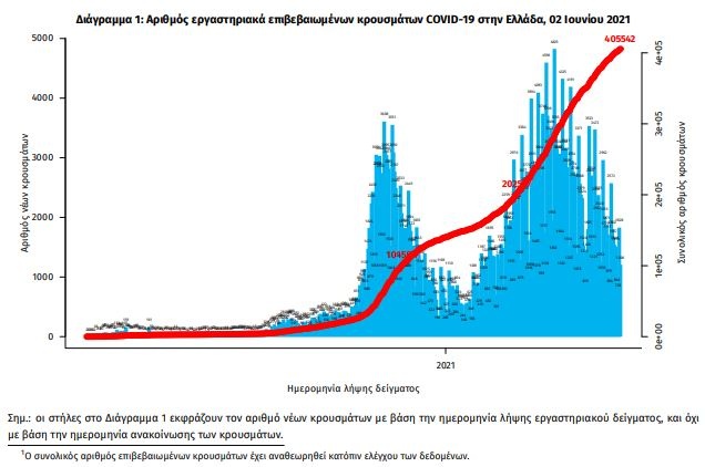 Κορονοϊός - Όλες οι ειδήσεις: Την Τετάρτη, 2 Ιουνίου 2021, ο ΕΟΔΥ ανακοίνωσε, 1.831 νέα κρούσματα του νέου ιού στη χώρα, εκ των οποίων ένα εντοπίστηκε κατόπιν ελέγχων στις πύλες εισόδου της χώρας.