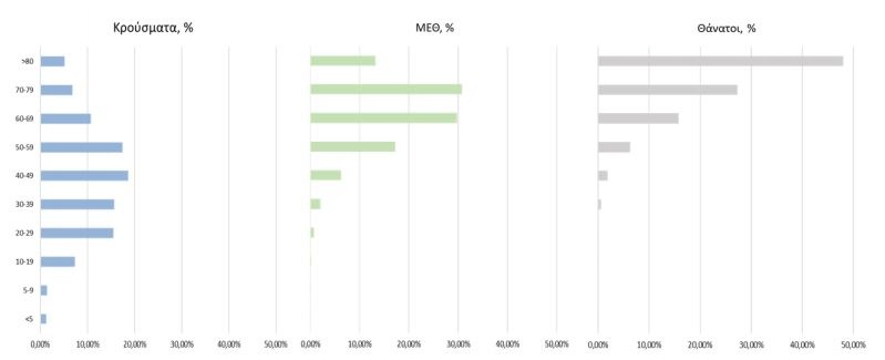 Διάγραμμα 4: Ηλικιακή Κατανομή κρουσμάτων, νοσηλευόμενων στις MEΘ και ασθενών που απεβίωσαν από την αρχή της πανδημίας.
