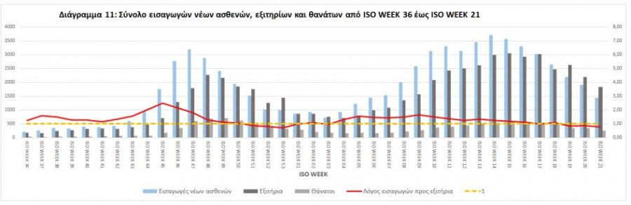 Την εβδομάδα 24 Μαΐου 2021 - 30 Μαΐου 2021 (2021-W21) οι εισαγωγές νέων ασθενών ήταν 1.433, ενώ το σύνολο των εξιτηρίων λόγω ίασης ήταν 1.827. O λόγος εισαγωγών νέων ασθενών προς εξιτήρια λόγω ίασης ήταν 0.78.