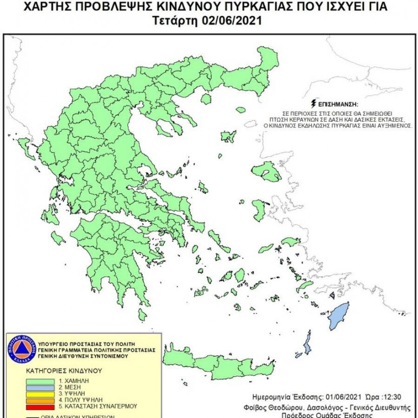 Ο κίνδυνος είναι χαμηλός. Η πιθανότητα για εκδήλωση πυρκαγιάς δεν είναι ιδιαίτερα υψηλή. Εάν εκδηλωθεί πυρκαγιά, οι συνθήκες (κατάσταση καύσιμης ύλης, μετεωρολογικές συνθήκες) δεν θα ευνοήσουν τη γρήγορη εξέλιξή της.