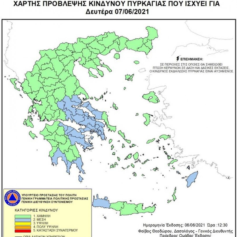 Φωτιές στην Ελλάδα - Όλες οι ειδήσεις: Σύμφωνα με το Χάρτη Πρόβλεψης Κινδύνου Πυρκαγιάς που εκδίδει η Γενική Γραμματεία Πολιτικής Προστασίας του Υπουργείου Εσωτερικών και Διοικητικής Ανασυγκρότησης, για σήμερα Δευτέρα, 7 Ιουνίου, προβλέπεται μέσος κίνδυνος πυρκαγιάς (κατηγορία κινδύνου 2), σε ορισμένες περιοχές της Ελλάδας.