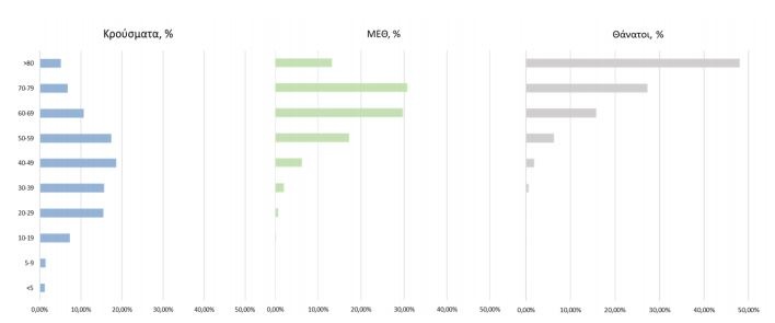 Ακολούθως παρουσιάζεται η ηλικιακή κατανομή των (α) συνολικών κρουσμάτων, (β) των περιστατικών που κατέληξαν σε θάνατο και (γ) των ασθενών που νοσηλεύονται διασωληνωμένοι:
