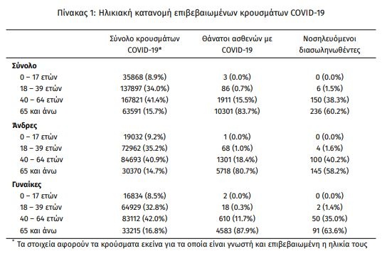 Οι νέοι θάνατοι ασθενών με COVID-19 είναι 24, ενώ από την έναρξη της επιδημίας έχουν καταγραφεί συνολικά 12.301 θάνατοι. Το 95.2% είχε υποκείμενο νόσημα ή/και ηλικία 70 ετών και άνω.