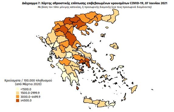 Πίνακας 2: Ημερήσιος αριθμός και κρούσματα ανά 100.000 πληθυσμού επιβεβαιωμένων εγχώριων κρουσμάτων COVID-19 ανά περιφερειακή ενότητα στις 07 Ιουνίου 2021.