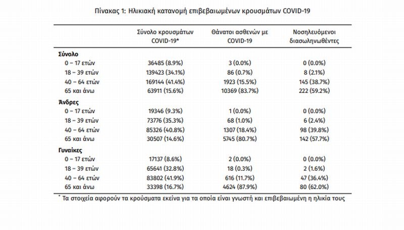 Ο αριθμός των ασθενών που νοσηλεύονται διασωληνωμένοι είναι 375 (65.5% άνδρες). Η διάμεση ηλικία τους είναι 67 έτη. To 86.9% έχει υποκείμενο νόσημα ή/και ηλικία 70 ετών και άνω. Από την αρχή της πανδημίας έχουν εξέλθει από τις ΜΕΘ 2.549 ασθενείς. Οι εισαγωγές νέων ασθενών Covid-19 στα νοσοκομεία της επικράτειας είναι 119 (ημερήσια μεταβολή +16.67%). Ο μέσος όρος εισαγωγών του επταημέρου είναι 128 ασθενείς.Η διάμεση ηλικία των κρουσμάτων είναι 43 έτη (εύρος 0.2 έως 106 έτη), ενώ η διάμεση ηλικία των θανόντων είναι 78 έτη (εύρος 0.2 έως 106 έτη).