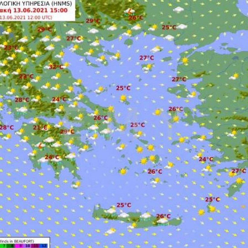 Άνεμοι: Δυτικοί βορειοδυτικοί 3 με 5 και από το απόγευμα στα Δωδεκάνησα τοπικά 6 μποφόρ.
