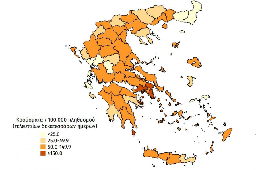 Γεωγραφική διασπορά: Ο χάρτης αποτυπώνει τη γεωγραφική κατανομή των συνολικών κρουσμάτων COVID-19 (από την αρχή της επιδημίας) ανά Περιφερειακή Ενότητα της χώρας, με βάση την δηλωθείσα διεύθυνση μόνιμης κατοικίας του ασθενούς, ή τη διεύθυνση προσωρινής διαμονής για τους τουρίστες και άλλους προσωρινά διαμένοντες στην Ελλάδα. Συμπεριλαμβάνονται τόσο κρούσματα με ιστορικό ταξιδίου (“εισαγόμενα”) όσο και κρούσματα με πιθανή εγχώρια μετάδοση.