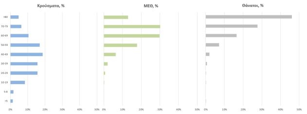 Ηλικιακή Κατανομή κρουσμάτων, νοσηλευόμενων στις MEΘ και ασθενών που απεβίωσαν από την αρχή της πανδημίας