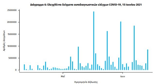 Έως 14 Ιουνίου 2021, έχουν καταγραφεί ηλεκτρονικά 20.280.345 δηλώσεις αποτελέσματος αυτοδιαγνωστικού ελέγχου, ενώ 384.876 άτομα προσήλθαν για επανέλεγχο.