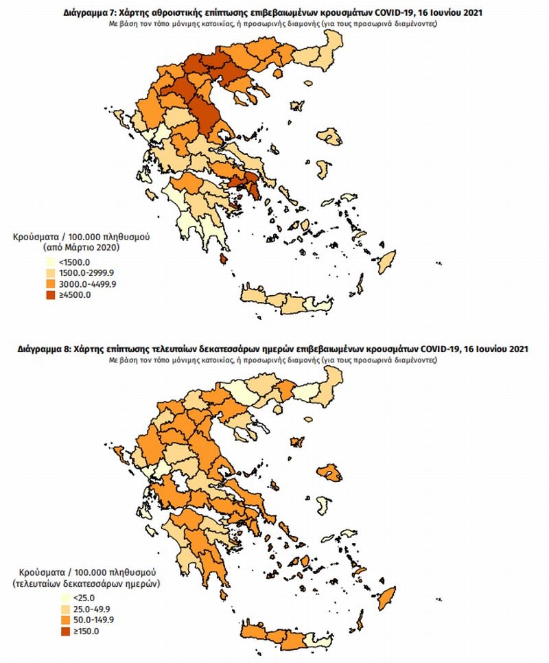 Ημερήσιος αριθμός και κρούσματα ανά 100.000 πληθυσμού επιβεβαιωμένων εγχώριων κρουσμάτων COVID-19 ανά περιφερειακή ενότητα στις 16 Ιουνίου 2021.