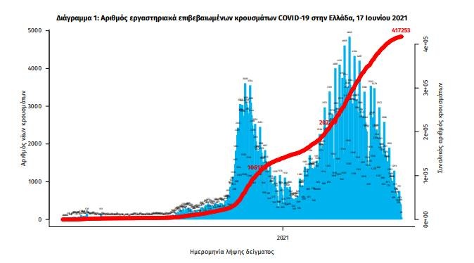 Με βάση τα δεδομένα που έχουν δηλωθεί στον ΕΟΔΥ και καταγραφεί μέχρι τις 17 Ιουνίου 2021 (ώρα 15:00), τα νέα εργαστηριακά επιβεβαιωμένα κρούσματα της νόσου που καταγράφηκαν τις τελευταίες 24 ώρες είναι 519, εκ των οποίων 2 εντοπίστηκαν κατόπιν ελέγχων στις πύλες εισόδου της χώρας.