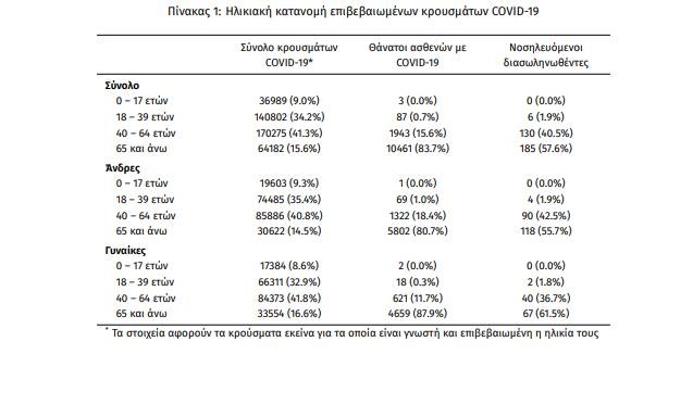 Ο αριθμός των ασθενών που νοσηλεύονται διασωληνωμένοι είναι 321 (65.9% άνδρες). Η διάμεση ηλικία τους είναι 67 έτη. To 86.0% έχει υποκείμενο νόσημα ή/και ηλικία 70 ετών και άνω. Από την αρχή της πανδημίας έχουν εξέλθει από τις ΜΕΘ 2.593 ασθενείς. Οι εισαγωγές νέων σθενών Covid-19 στα νοσοκομεία της επικράτειας είναι 61 (ημερήσια μεταβολή -24.69%). Ο μέσος όρος εισαγωγών του επταημέρου είναι 89 ασθενείς.Η διάμεση ηλικία των κρουσμάτων είναι 43 έτη (εύρος 0.2 έως 106 έτη), ενώ η διάμεση ηλικία των θανόντων είναι 78 έτη (εύρος 0.2 έως 106 έτη).