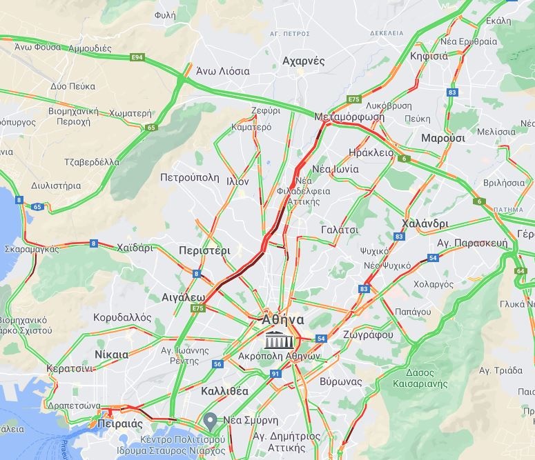 Στην άνοδο της λεωφόρου Κηφισού τα προβλήματα ξεκινούν από το ύψος του Αιγάλεω και συνεχίζονται μέχρι σχεδόν την Κηφισιά με ένα μικρό «διάλειμμα» όπως προκύπτει από τον χάρτη της Google.