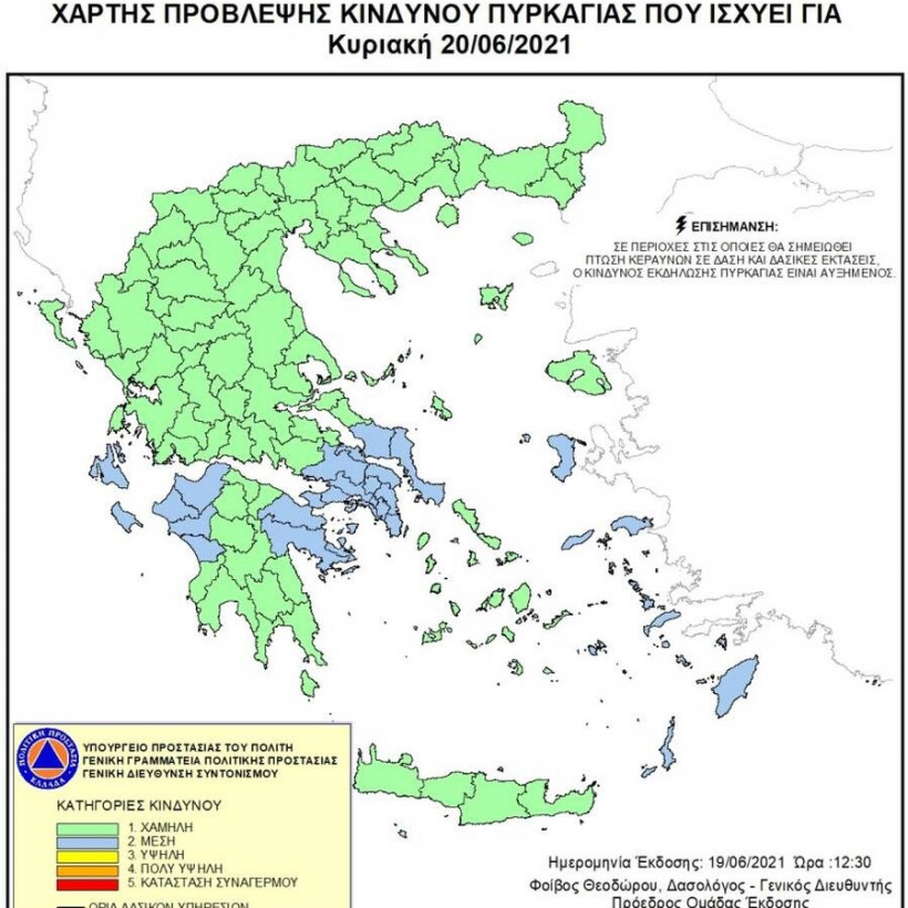 Φωτιές στην Ελλάδα - Όλες οι ειδήσεις: Σύμφωνα με το Χάρτη Πρόβλεψης Κινδύνου Πυρκαγιάς που εκδίδει η Γενική Γραμματεία Πολιτικής Προστασίας του Υπουργείου Εσωτερικών και Διοικητικής Ανασυγκρότησης, για σήμερα Κυριακή 20 Ιουνίου, προβλέπεται μέσος κίνδυνος πυρκαγιάς (κατηγορία κινδύνου 2), σε κάποιες περιοχές της Ελλάδας.