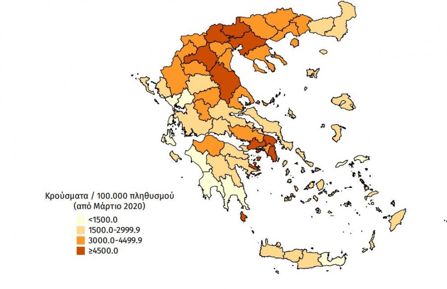 Γεωγραφική διασπορά: Ο χάρτης αποτυπώνει τη γεωγραφική κατανομή των συνολικών κρουσμάτων COVID-19 (από την αρχή της επιδημίας) ανά Περιφερειακή Ενότητα της χώρας, με βάση την δηλωθείσα διεύθυνση μόνιμης κατοικίας του ασθενούς, ή τη διεύθυνση προσωρινής διαμονής για τους τουρίστες και άλλους προσωρινά διαμένοντες στην Ελλάδα. Συμπεριλαμβάνονται τόσο κρούσματα με ιστορικό ταξιδίου (“εισαγόμενα”) όσο και κρούσματα με πιθανή εγχώρια μετάδοση.