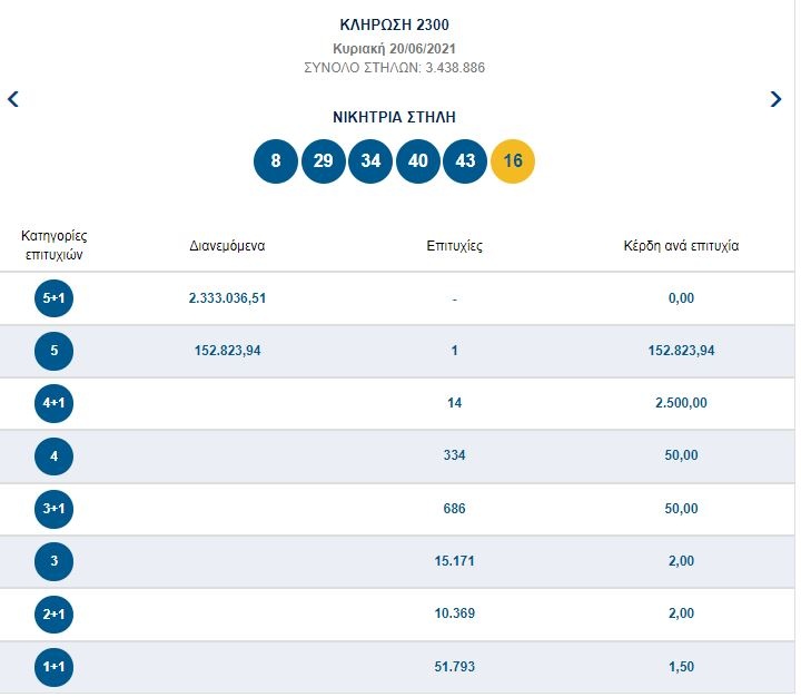 Οι τυχεροί αριθμοί που έβγαλε η κληρωτίδα της αποψινής κλήρωσης είναι οι: 43, 8, 40, 34, 29 και Τζόκερ ο αριθμός 16.