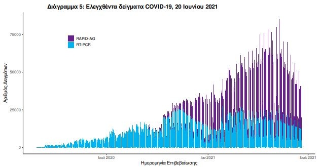 Στις 19 Ιουνίου 2021, πραγματοποιήθηκαν 24 δράσεις δειγματοληπτικών ελέγχων από τις Κινητές Ομάδες Υγείας (ΚΟΜΥ) του ΕΟΔΥ, στις οποίες διενεργήθηκαν 3.629 έλεγχοι Rapid Ag και ανευρέθηκαν 21 θετικά (0,58%).