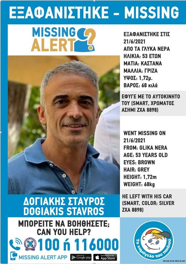 «Στις 21 Ιουνίου 2021 εξαφανίστηκε από την περιοχή Γλυκά Νερά, ο Σταύρος Δογιάκης, 53 ετών. Το «Χαμόγελο του Παιδιού» ενημερώθηκε για την εξαφάνιση του Σταύρου Δογιάκη στις 22 Ιουνίου 2021 και προχώρησε στη δημοσιοποίηση των στοιχείων του ενήλικου κατόπιν αιτήματος του οικογενειακού του περιβάλλοντος, καθώς συντρέχουν λόγοι οι οποίοι θέτουν τη ζωή του σε κίνδυνο. Ο Σταύρος Δογιάκης έχει ύψος 1.72μ., είναι 68 κιλά, έχει γκρίζα μαλλιά και καστανά μάτια. Έφυγε με το όχημά του, μάρκας Smart χρώματος ασημί, με πινακίδα αριθμού κυκλοφορίας ΖΧΑ-8898».