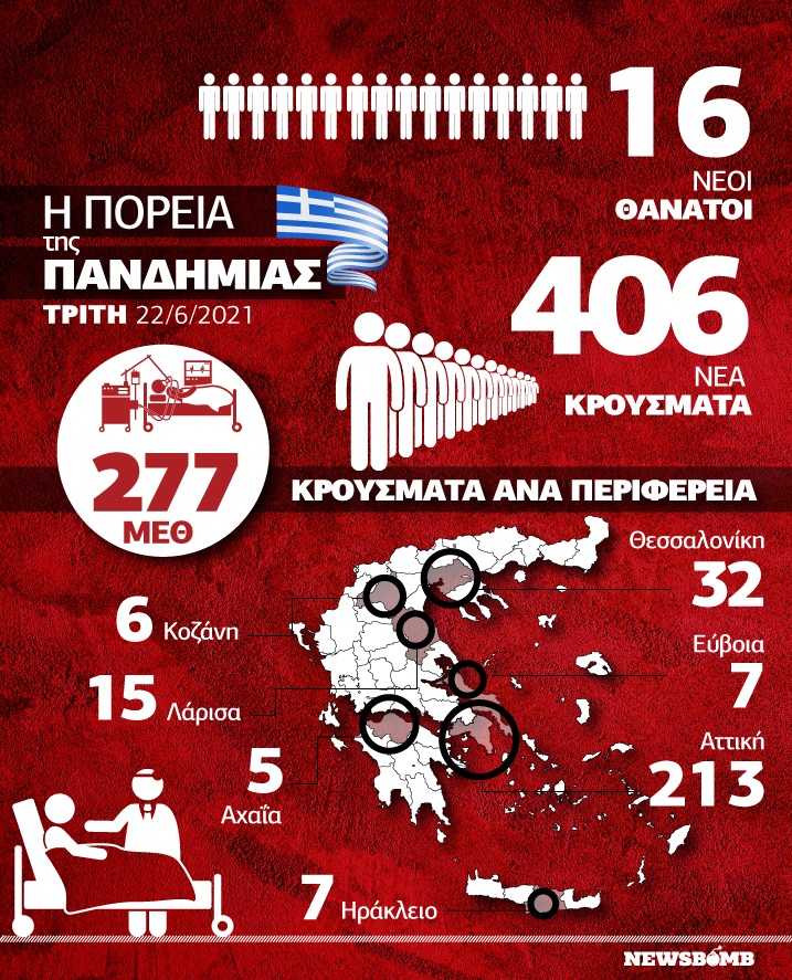 Την Τρίτη (22.06) ανακοινώθηκαν 406 νέα κρούσματα, με την πτωτική τάση να επιβεβαιώνεται, ενώ ιδιαίτερα ενθαρρυντικό είναι το γεγονός πως συνεχίζεται και η μείωση στον αριθμό των ασθενών που νοσηλεύονται στις ΜΕΘ.