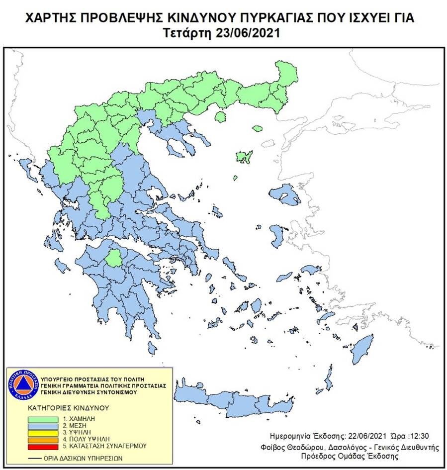 Σύμφωνα με το Χάρτη Πρόβλεψης Κινδύνου Πυρκαγιάς που εκδίδει η Γενική Γραμματεία Πολιτικής Προστασίας του Υπουργείου Εσωτερικών και Διοικητικής Ανασυγκρότησης, για σήμερα Τετάρτη 23 Ιουνίου, προβλέπεται μέσος κίνδυνος πυρκαγιάς (κατηγορία κινδύνου 2), σε κάποιες περιοχές της Ελλάδας.