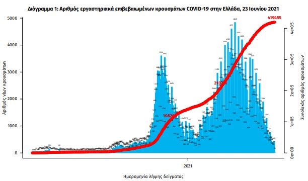 Με βάση τα δεδομένα που έχουν δηλωθεί στον ΕΟΔΥ και καταγραφεί μέχρι τις 23 Ιουνίου 2021 (ώρα 15:00), τα νέα εργαστηριακά επιβεβαιωμένα κρούσματα της νόσου που καταγράφηκαν τις τελευταίες 24 ώρες είναι 520, εκ των οποίων 1 εντοπίστηκε κατόπιν ελέγχων στις πύλες εισόδου της χώρας.