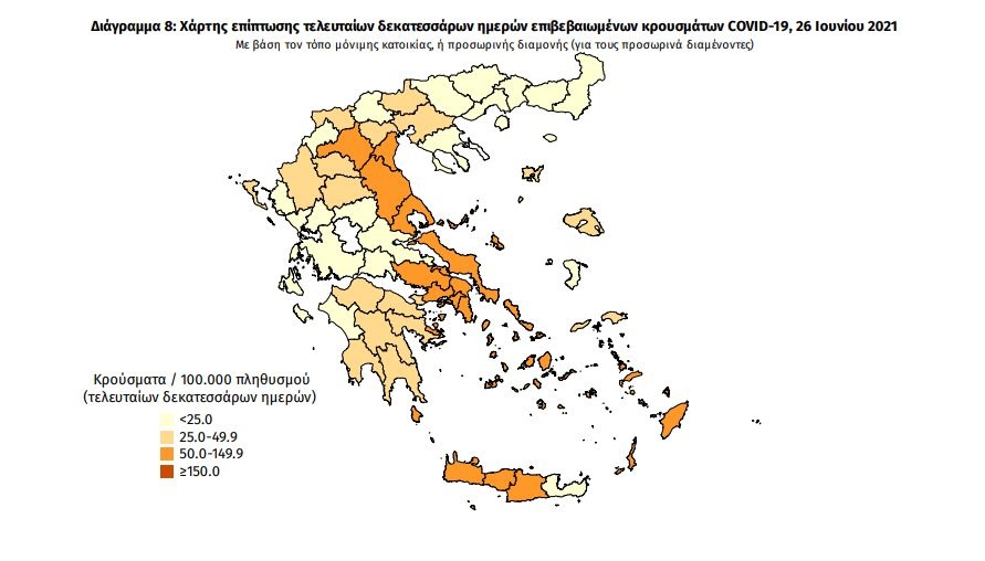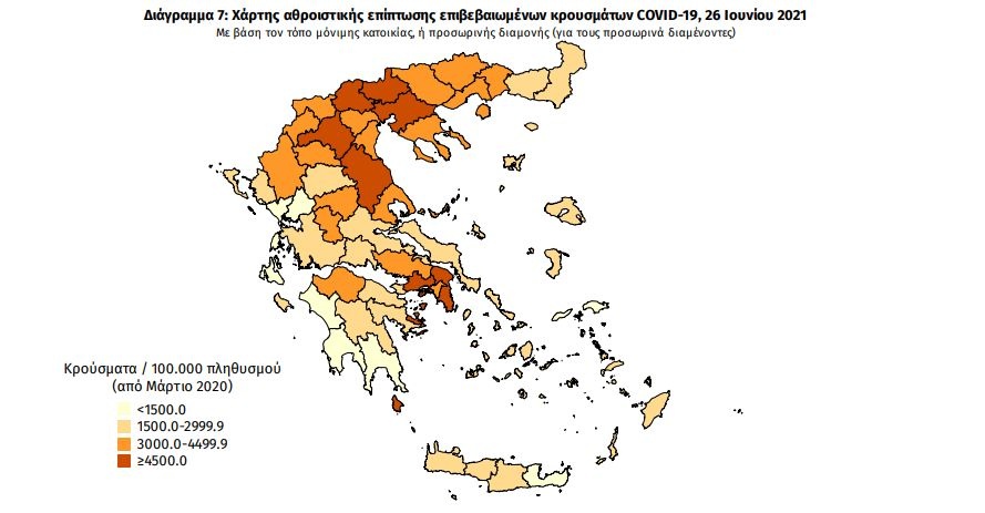 Χάρτης αθροιστικής επίπτωσης επιβεβαιωμένων κρουσμάτων COVID-19, 21 Ιουνίου 2021. Με βάση τον τόπο μόνιμης κατοικίας, ή προσωρινής διαμονής (για τους προσωρινά διαμένοντες)