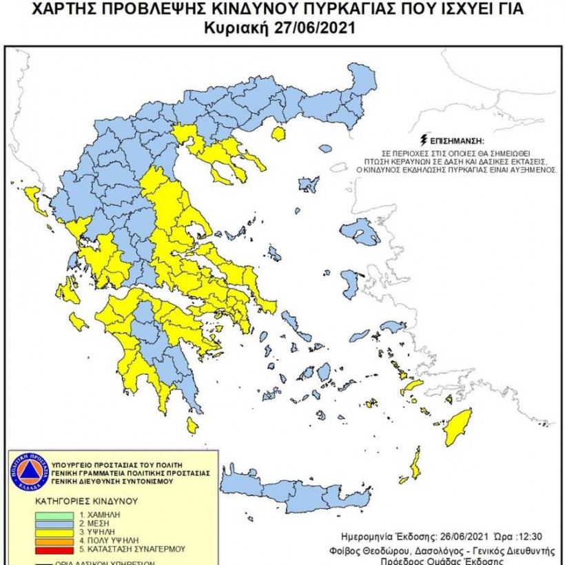 Φωτιές στην Ελλάδα - Όλες οι ειδήσεις: Σύμφωνα με το Χάρτη Πρόβλεψης Κινδύνου Πυρκαγιάς που εκδίδει η Γενική Γραμματεία Πολιτικής Προστασίας του Υπουργείου Εσωτερικών και Διοικητικής Ανασυγκρότησης, για σήμερα Κυριακή 27 Ιουνίου, προβλέπεται υψηλός κίνδυνος πυρκαγιάς (κατηγορία κινδύνου 3), σε  Αττική, Εύβοια, περιοχές Στερεάς Ελλάδας, Πελοποννήσου, Θεσσαλίας, Ηπείρου και Θεσσαλονίκης, Χαλκιδική, Θάσο, Δωδεκάνησα, Κύθηρα και σε νησιά του Ιονίου