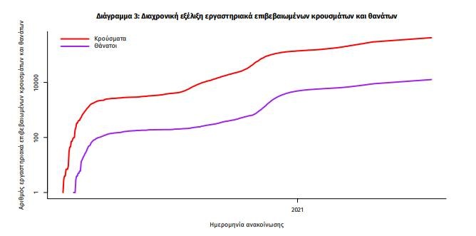 Η διαχρονική εξέλιξη των συνολικών κρουσμάτων και συνολικού αριθμού των θανάτων ασθενών COVID-19 παρουσιάζεται στο ακόλουθο διάγραμμα.