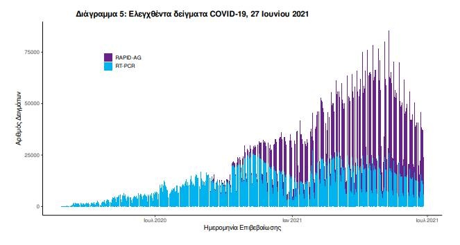Δείγματα που έχουν ελεγχθεί: Από την 1η Ιανουαρίου 2020 μέχρι σήμερα, στα εργαστήρια που διενεργούν ελέγχους για τον νέο κορωνοϊό (SARS-CoV-2) και που δηλώνουν συστηματικά το σύνολο των δειγμάτων που ελέγχουν, έχουν συνολικά ελεγχθεί 5.383.416 κλινικά δείγματα ενώ από Μονάδες Υγείας και Κλιμάκια του ΕΟΔΥ που διενεργούν ελέγχους Rapid Ag έχουν ελεγχθεί 5.145.534 δείγματα. O μέσος όρος του επταημέρου είναι 31.413 δειγματοληπτικοί έλεγχοι.