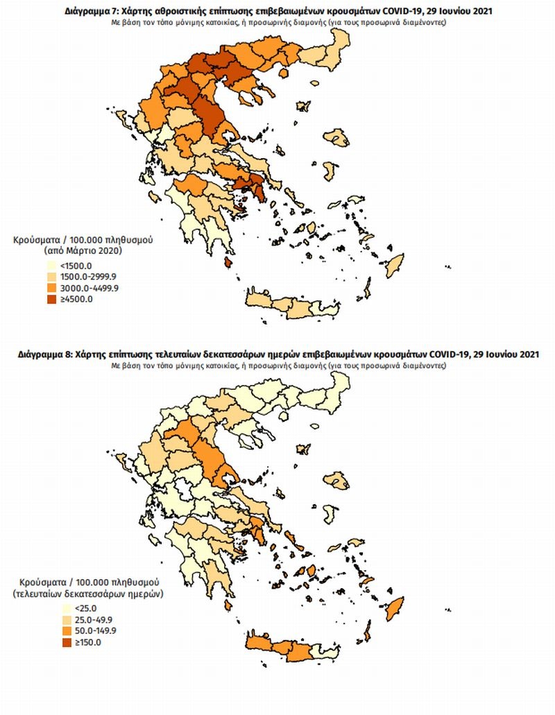 Ημερήσιος αριθμός και κρούσματα ανά 100.000 πληθυσμού επιβεβαιωμένων εγχώριων κρουσμάτων COVID-19 ανά περιφερειακή ενότητα στις 29 Ιουνίου 2021.
