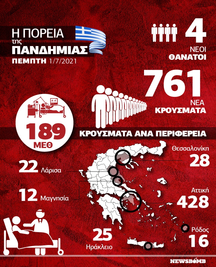 Στην Ελλάδα την Πέμπτη (01.07), ανακοινώθηκαν 761 νέα κρούσματα κορονοϊού ενώ την ίδια ώρα οι άνθρωποι που νοσηλεύονται στις ΜΕΘ είναι 189. Οι νέοι θάνατοι που ανακοινώθηκαν ήταν μόλις 4, με τον αριθμό να είναι μονοψήφιος για πρώτη φορά μετά από σχεδόν οκτώ μήνες!