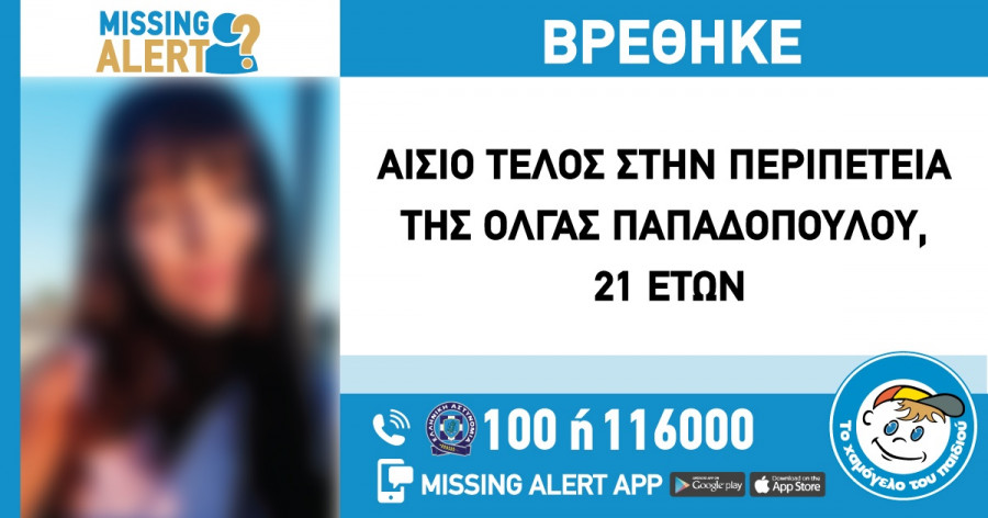 Η περιπέτεια της Όλγας Παπαδοπούλου, 21 ετών, έληξε σήμερα 1 Ιουλίου 2021, βραδινές ώρες, δίνοντας τέλος στην αγωνία των δικών της ανθρώπων που την αναζητούσαν.